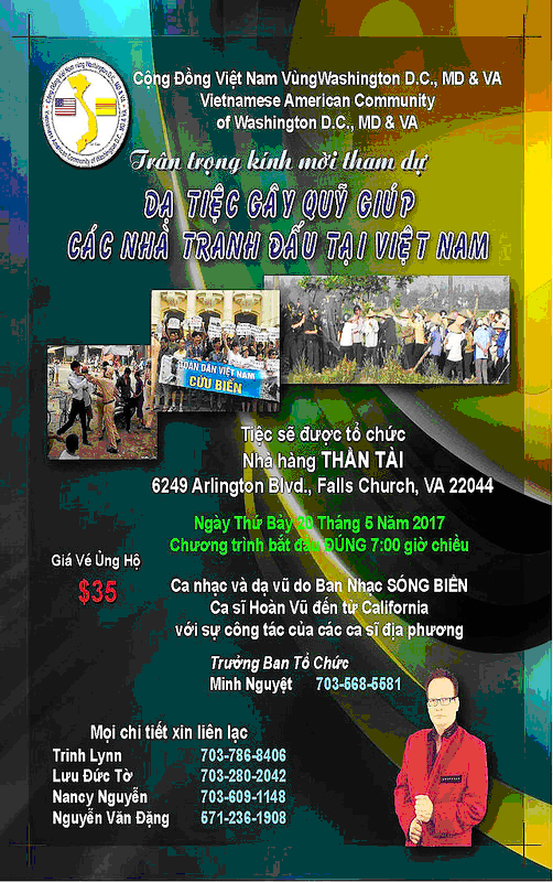 Ngày 20 tháng 5, 2017 sắp tới, tại nhà hàng Thần Tài, Tổ Chức Cộng Đồng VN Wash. DC area sẽ có 1 buổi dạ tiệc gây quỹ giúp các nhà đấu tranh trong nước.