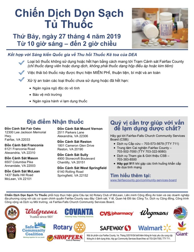 Take advantage of a free, convenient, confidential, and safe disposal of unused or expired medications during Operation Medicine Cabinet Cleanout on Saturday, April 27, 2019. Drop off medications at any of the eight Fairfax County District Police Stations (pills or liquids only, no pressurized canisters or needles) between 10 a.m. and 2 p.m.