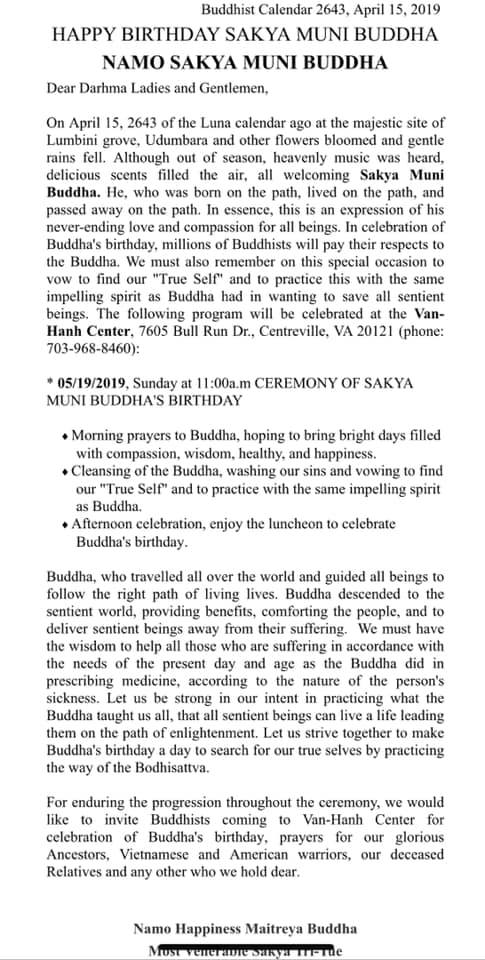 On April 15, 2642 of the Luna calendar ago at the majestic site of Lumbini grove, Udumbara and other flowers bloomed and gentle rains fell. Although out of season, heavenly music was heard, delicious scents filled the air, all welcoming Sakya Muni Buddha. He, who was born on the path, lived on the path, and passed away on the path. In essence, this is an expression of his never-ending love and compassion for all beings. In celebration of Buddha’s birthday, millions of Buddhists will pay their respects to the Buddha. We must also remember on this special occasion to vow to find our “True Self” and to practice this with the same impelling spirit as Buddha had in wanting to save all sentient beings. The following program will be celebrated at the Van-Hanh Center, 7605 Bull Run Dr., Centreville, VA 20121 (phone: 703-968-8460):