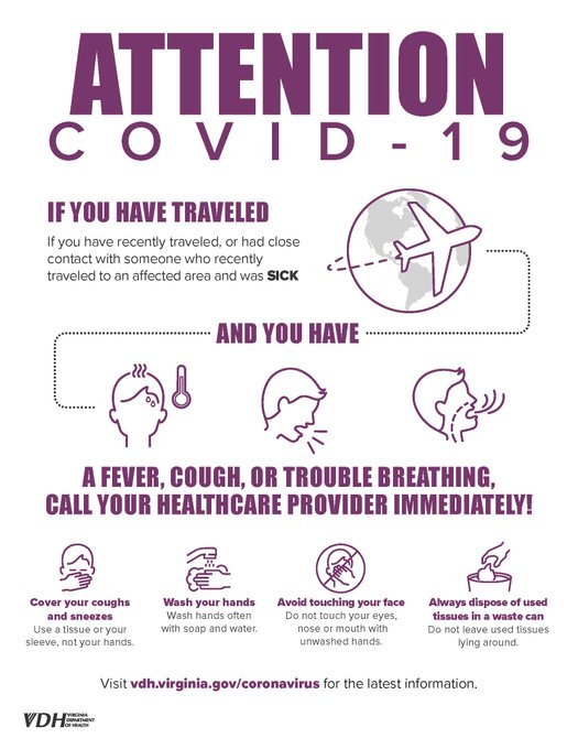 Virginia’s state and local public health leaders announced two presumptive positive cases of coronaviruses disease earlier today. The first individual is a Marine Base Corps Quantico resident who is at Fort Belvoir. The second individual is a resident of the City of Fairfax in their 80s who traveled on a similar Nile River cruise as other positive coronavirus (COVID-19) patients. See the press release for more information.
