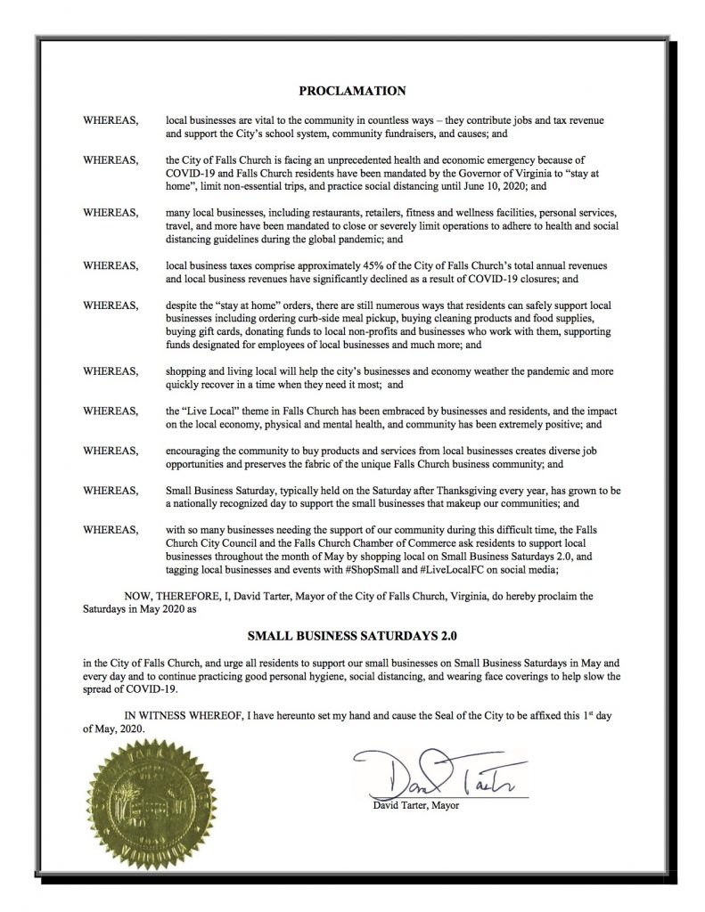 Thị trưởng David Tarter của Thành phố Falls Church ra tuyên bố mỗi thứ Bảy trong tháng 5 Năm 2020 là Thứ Bảy cho Doanh Nghiệp Nhỏ