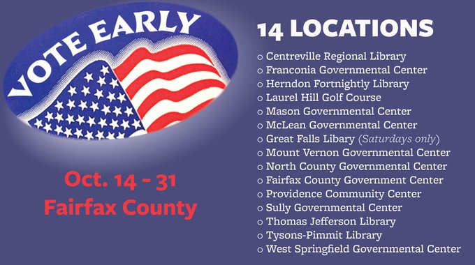 Any registered Fairfax County voter can vote early, and can cast their ballot at any early voting site. The last day to vote early is Saturday, Oct. 31, at 5 p.m.