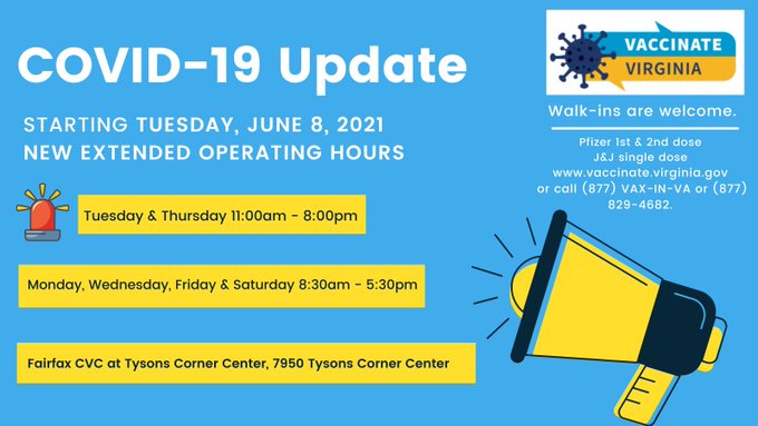 Trung Tâm Tysons Community Vaccination mở cửa thêm giờ vào buổi tối; và Địa điểm này dự định đóng hẳn vào ngày 26 tháng 6 năm 2021.