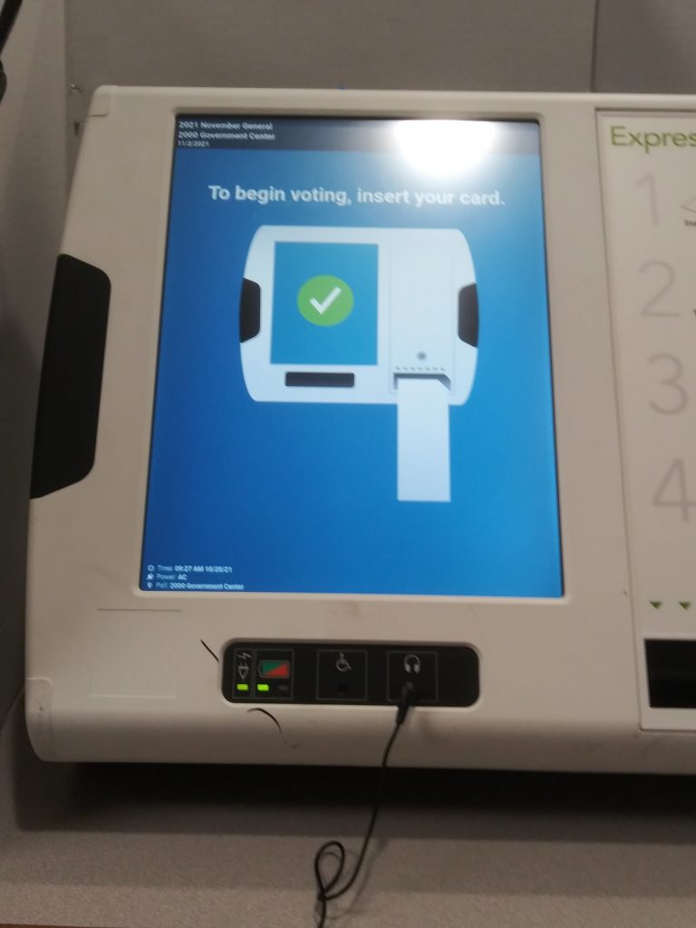 Hình ảnh ứng cử viên Glenn Youngkin và vợ sử dụng “ExpressVote machine” hay “Ballot Marking Device” trong cuộc bỏ phiếu sớm tại Fairfax County Government Center vào ngày 23 tháng 9 năm 2021