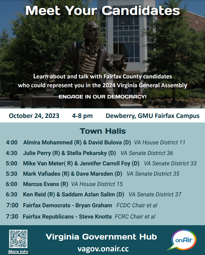 Democracy onAir là một tổ chức phi lợi nhuận phi đảng phái do cựu sinh viên Mason quản lý. Thông tin: https://vagov.onair.cc/meet-your-candidates-fairfax/