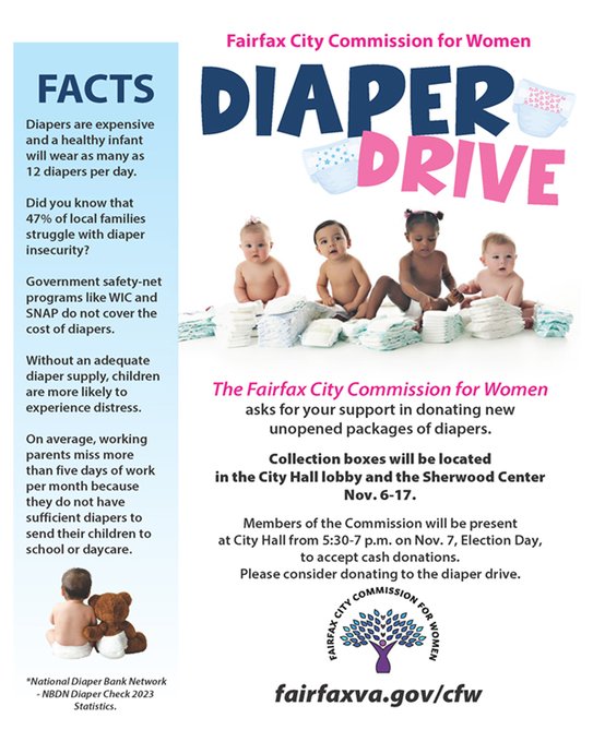Diaper Drive Nov. 6-17 sponsored by the City of Fairfax Commission for WomenThe City of Fairfax Commission for Women is holding a diaper drive Nov. 6-17.