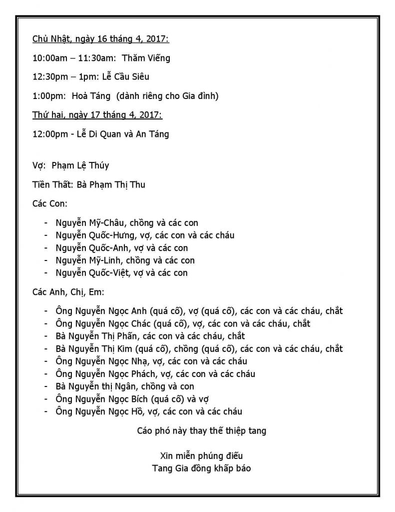 Cáo phó – Giáo Sư Nguyễn Ngọc Linh, từ trần tại Virginia, hôm nay Chủ Nhật 9 tháng 4, 2017.
