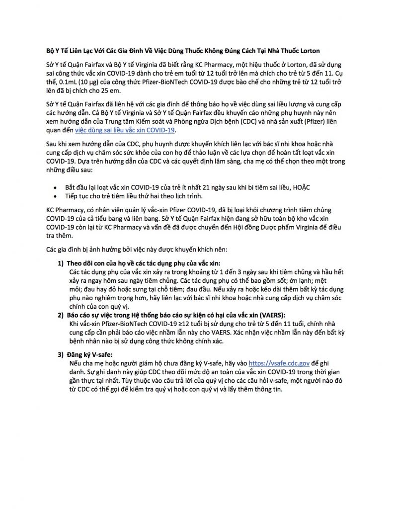 Sở Y tế Quận Fairfax và Bộ Y tế Virginia đã biết rằng KC Pharmacy, một hiệu thuốc ở Lorton, đã sử dụng sai công thức vắc xin COVID-19 dành cho trẻ em tuổi từ 12 tuổi trở lên mà chích cho trẻ từ 5 đến 11. Cụ thể, 0.1mL (10 µg) của công thức Pfizer-BioNTech COVID-19 được bào chế cho những trẻ từ 12 tuổi trở lên đã bị chích cho 25 em.